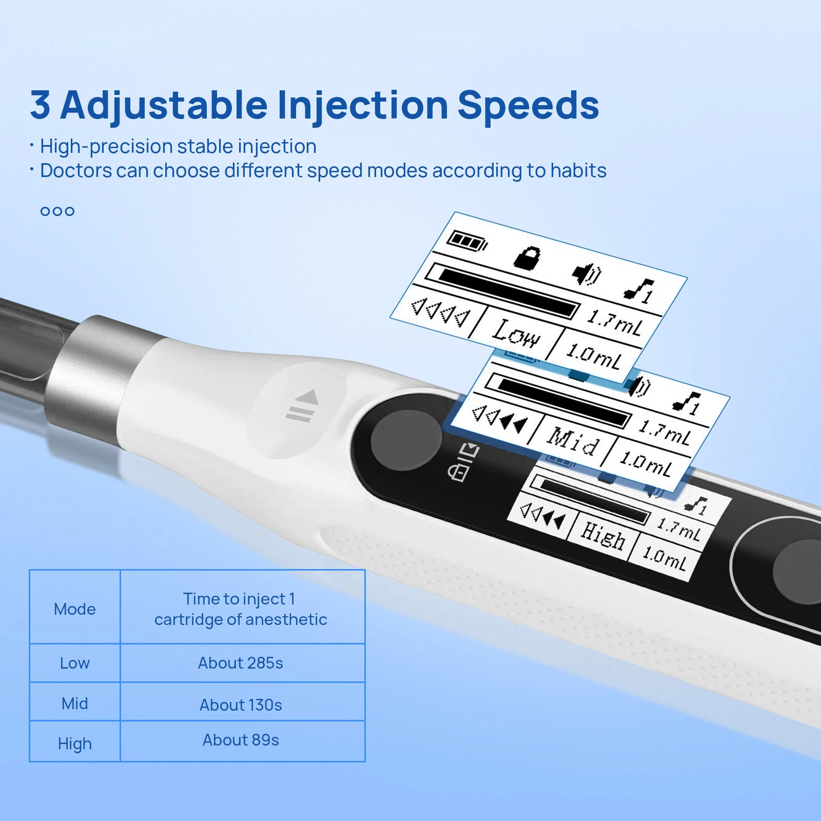 ✓ Ba chế độ tiêm tùy chỉnh linh hoạt: Cung cấp 3 tốc độ tiêm được cài đặt sẵn, cho phép nha sĩ lựa chọn chế độ phù hợp nhất với từng bệnh nhân và vùng điều trị, giúp tối ưu hóa hiệu quả và sự thoải mái: