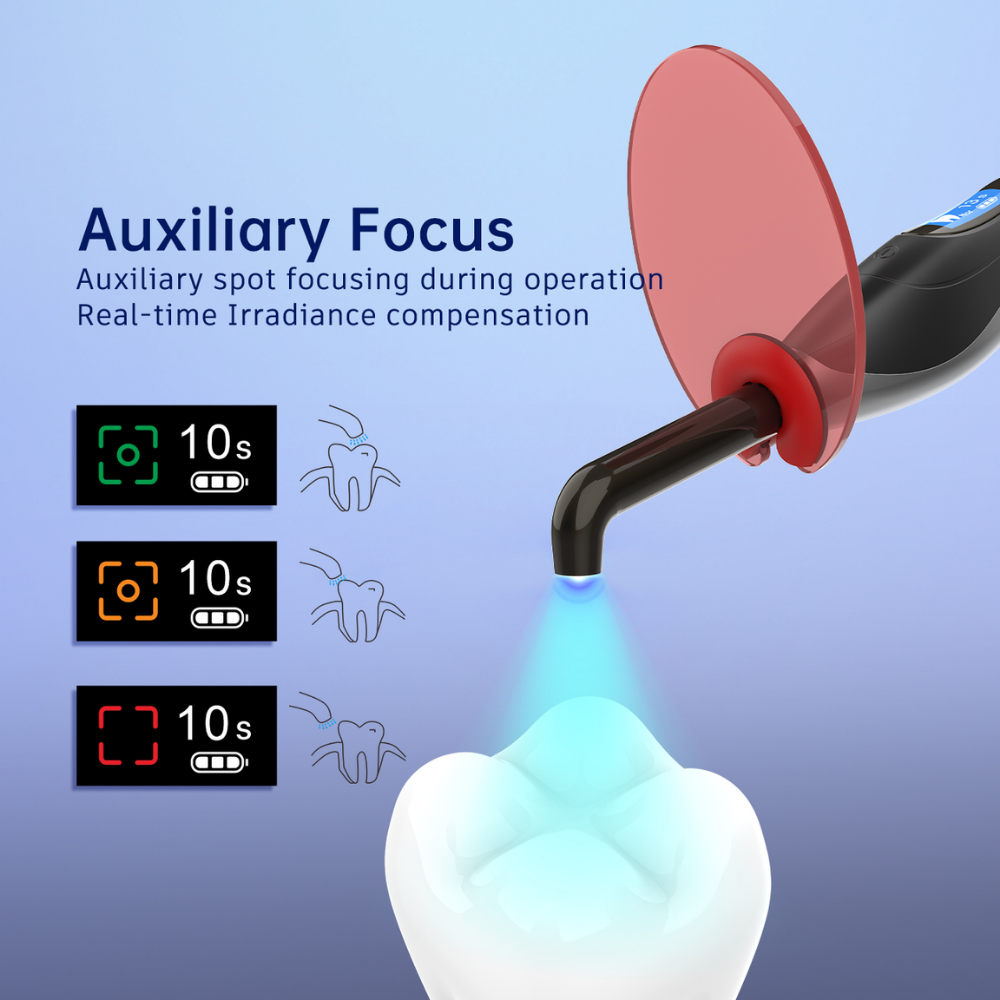 ✓ Công nghệ LED tiên tiến & cường độ cao: Sản phẩm được trang bị đèn LED cường độ cao, cung cấp luồng ánh sáng mạnh mẽ và đồng đều. Với công suất cực đại lên đến >3100mw/cm² (chế độ Chỉnh nha), đèn giúp hoạt hóa vật liệu composite một cách nhanh chóng và triệt để, đảm bảo độ bền và thẩm mỹ cho miếng trám.
